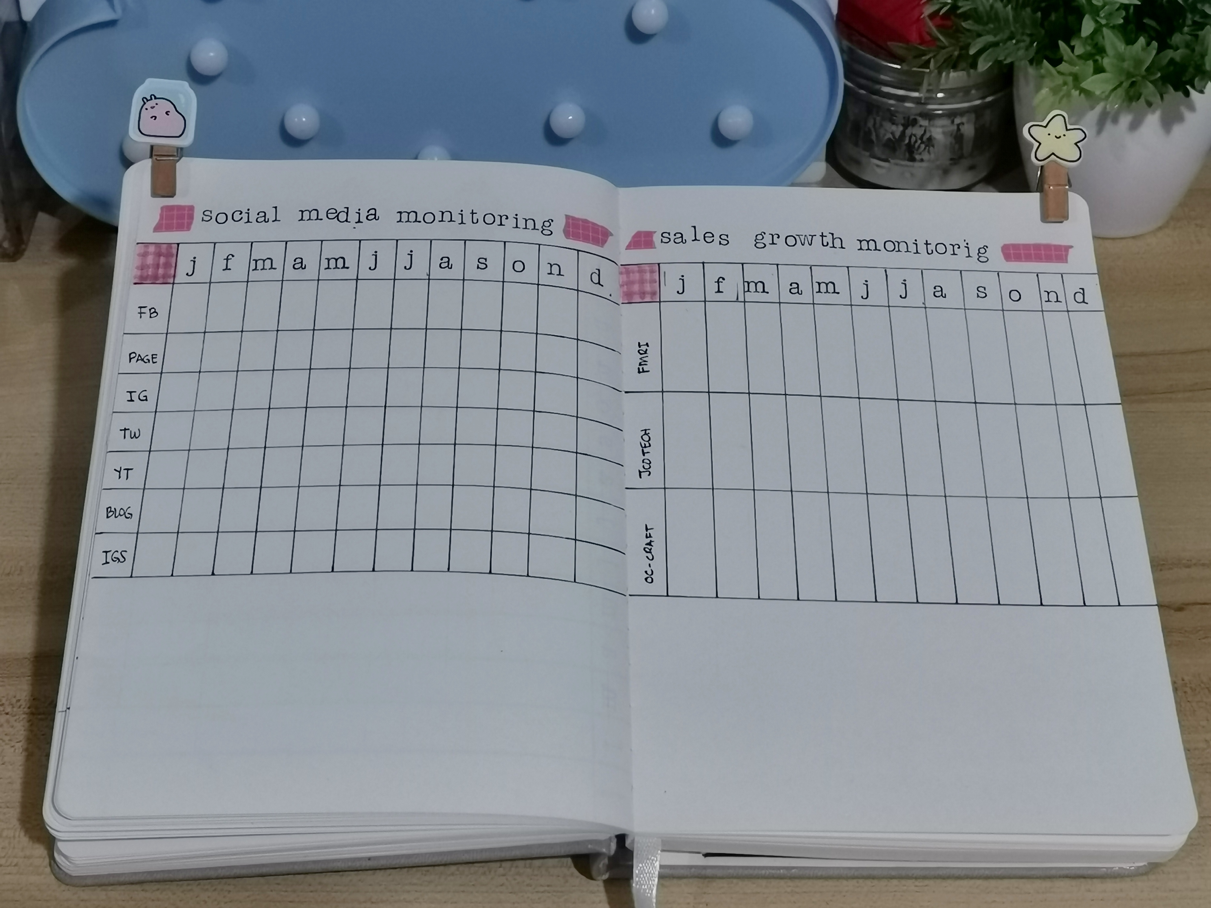 My three goals for this year are listed here. Journaling in a planner, writing blog posts, making video blogs, and doing business planning. This layout is appealing to me. It's easy to monitor plans each month.